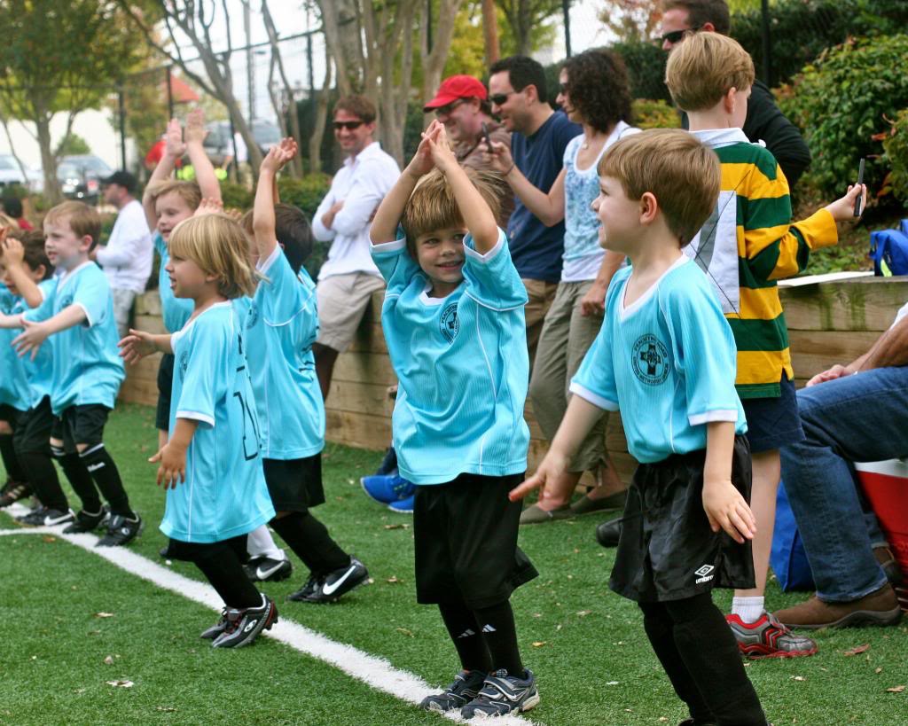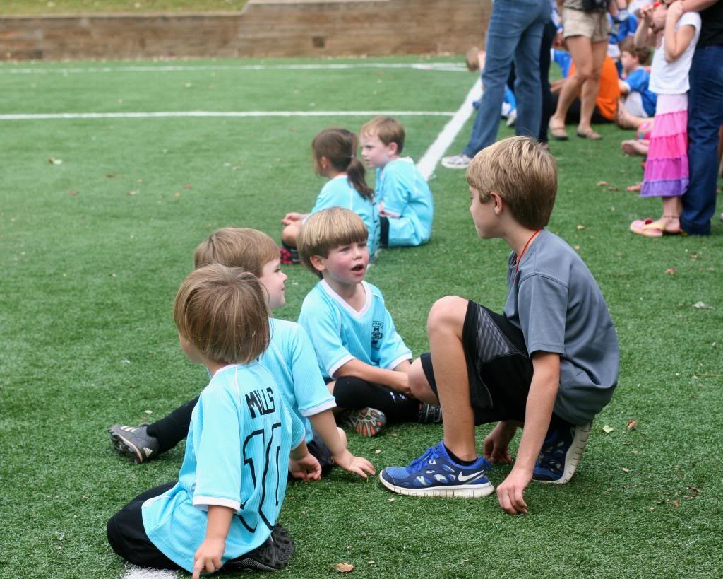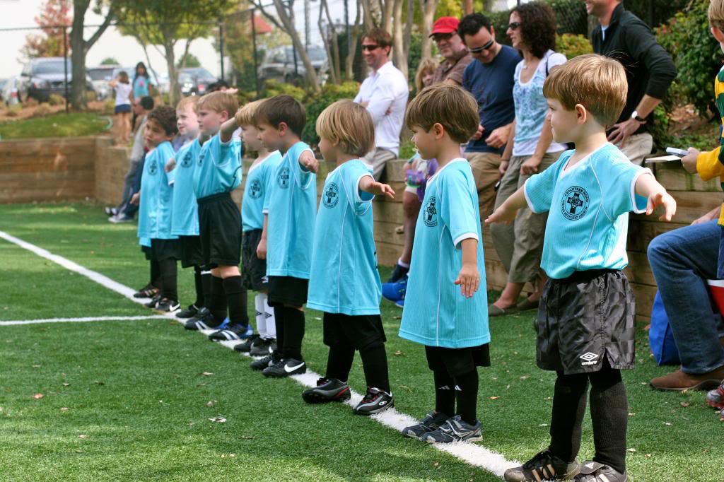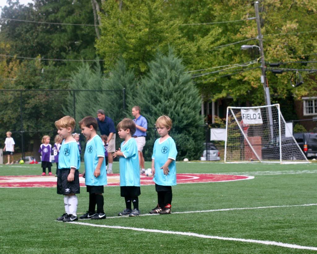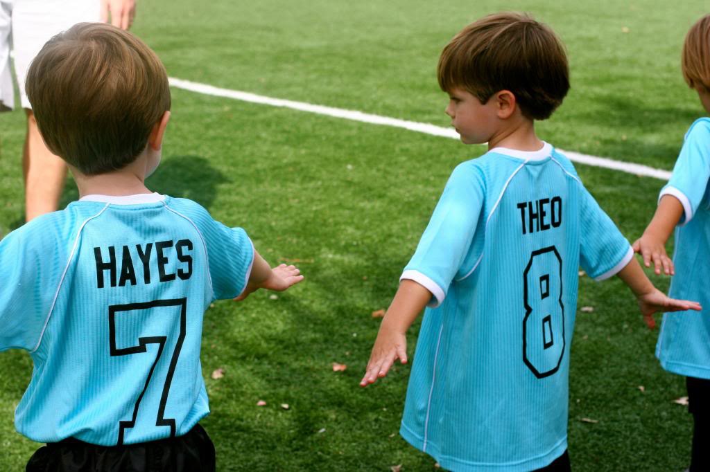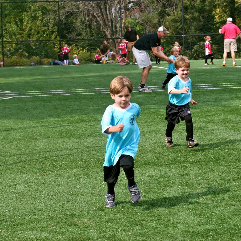 Neither Russ nor I know squat-diddly about soccer, and it shows. Jack and Tucker both played on a 4-year old team, and it was a frustrating experience on multiple levels. You have to realize the 4-year olds are much more excited by an airplane flying overhead or a patch of clover that needs to be picked than playing a game, and you head to the field expecting that. And you won’t be disappointed because the 4-year olds are too busy enjoying the world to notice the ball go rolling by, and when you don’t know a single thing about soccer, you don’t feel obligated to try to refocus the kids or find a teachable moment. If you’re not an uber-competitive maniac who has played team sports since she was 5, then it’s all good.