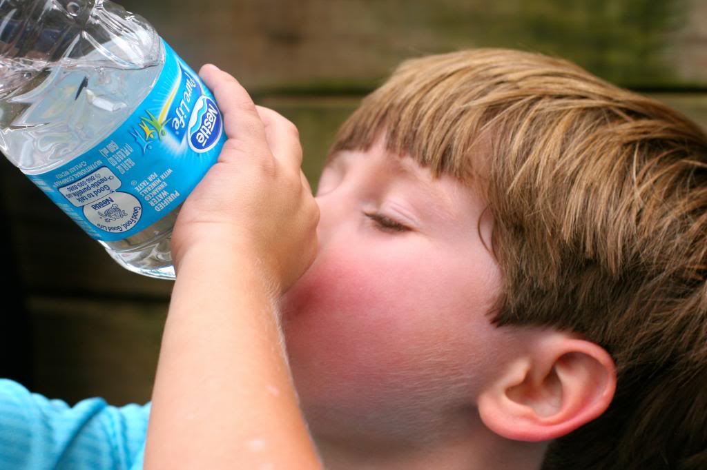 Water break at half-time. You can really work up a sweat running in a pack like that.