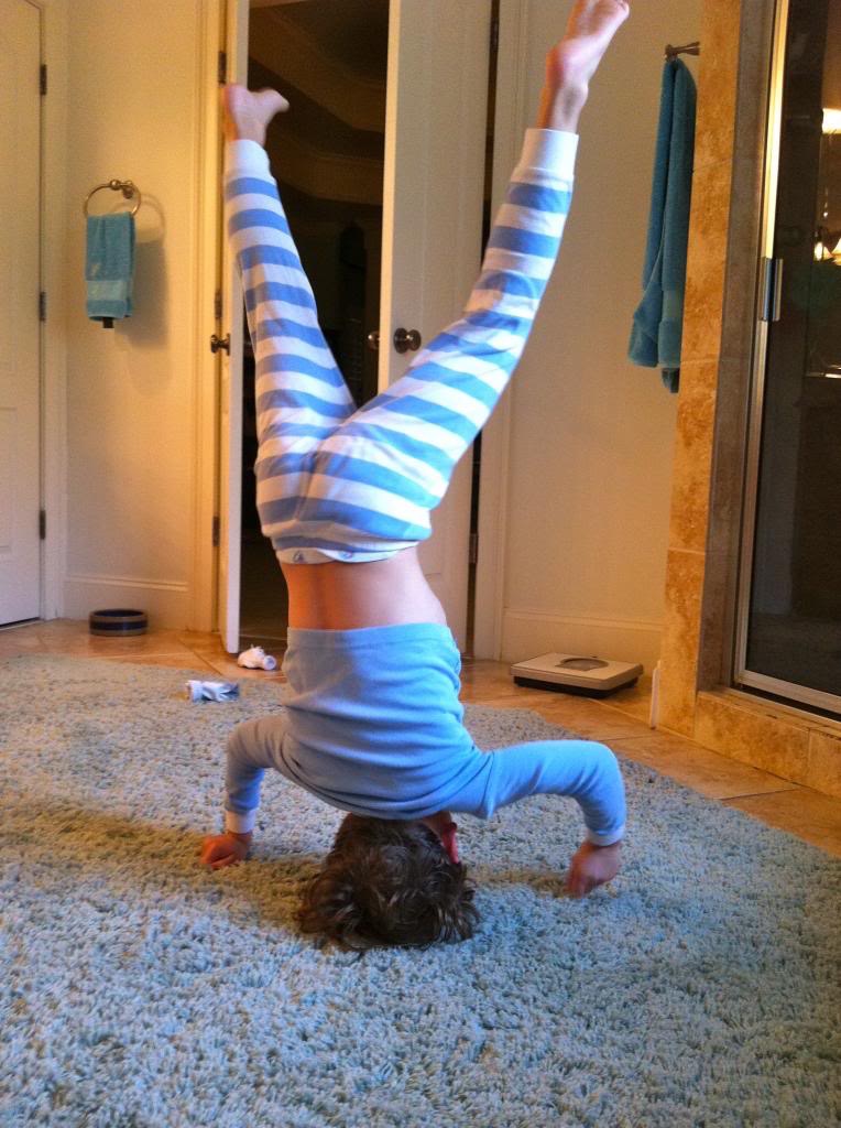 Meanwhile, Tucker perfected his own new stunt: the headstand. Tucker spends half his time this way now.