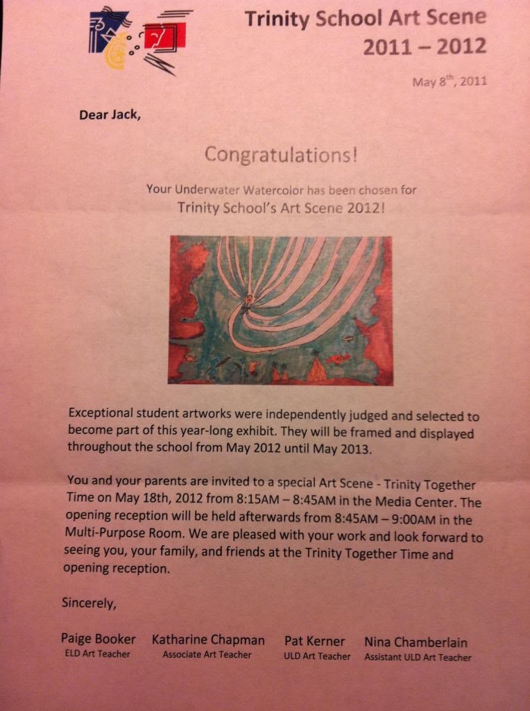 Proof of Ms. Emily’s fantastic art teaching abilities: Jack has a watercolor chosen to be on display for the entire school year at Trinity!