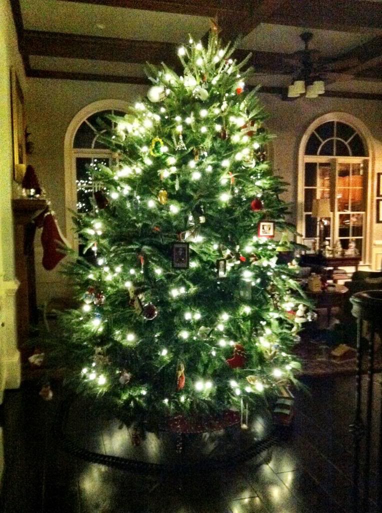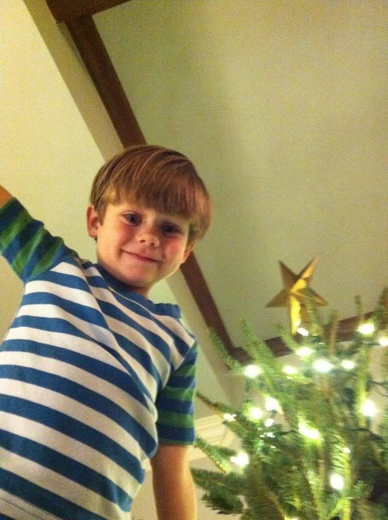 Our halls typically take a few days to deck; this year was no exception. Here, Tuck places the star atop the tree the night after we put it up.
