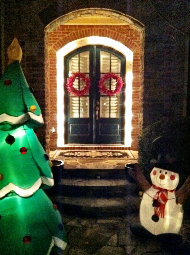 Finally, our neon green skull from Halloween just serves as a warm-up for our neighbors. The photo below shows just 2 of the 3 fine, fine pieces of yard art the Herako-griswolds have staked in their front yard this month.