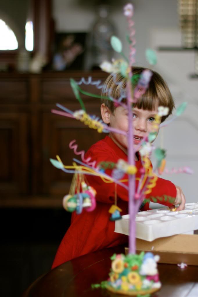 Sweet Mama B shines through my boys in their love of Extreme Seasonal Decoration. Theo unboxed and set up Mama B’s Easter Tree all by himself. I remember this crazy thing from growing up and am so happy to have it around our house to help pump up the pre-Easter pastels. Nothing says “most important celebration of one’s faith” like a bright pink tree with tiny chicks, eggs and bunnies hanging from it.
