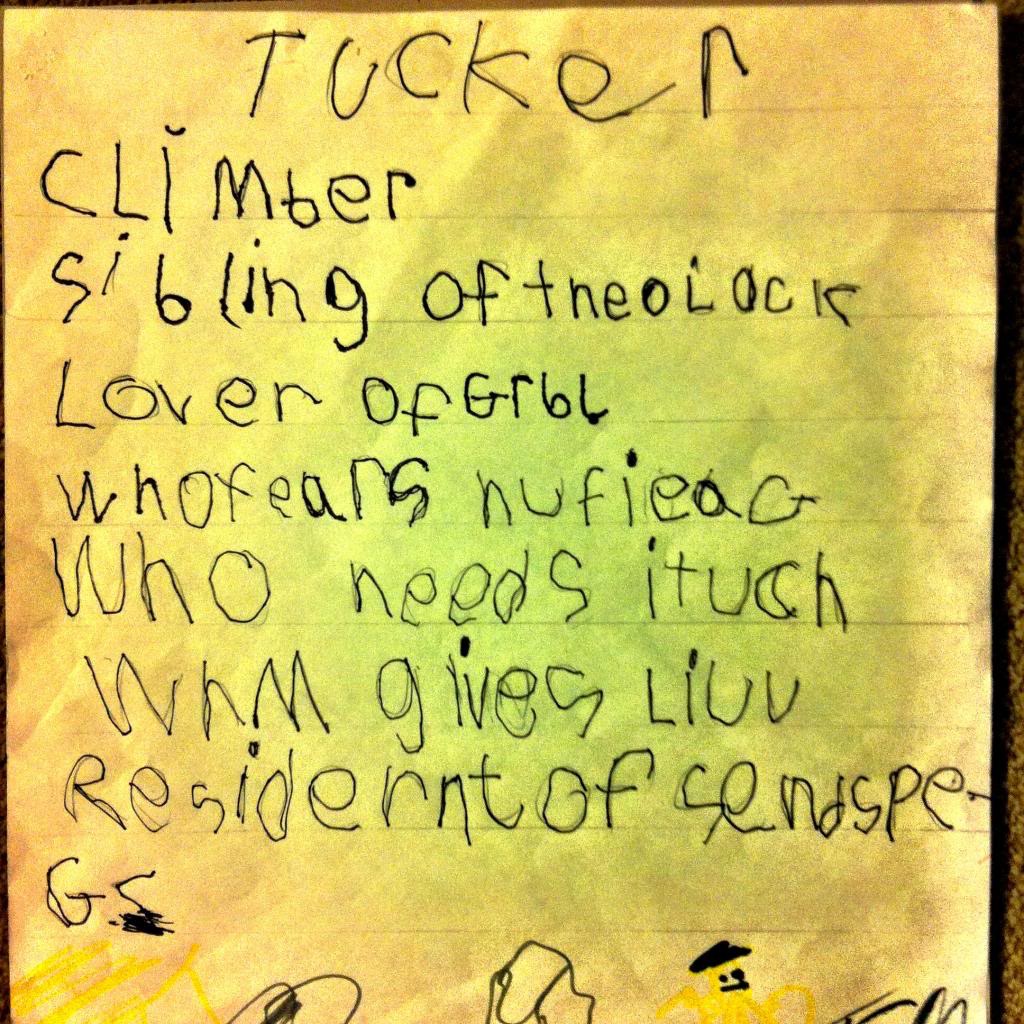 Once he began kindergarten, he would not write his name with a capital “T”. So then papers came home saying “tcuker” or “tukcer”. “We’re not worried,” educators told me. But of course, I still worried.
