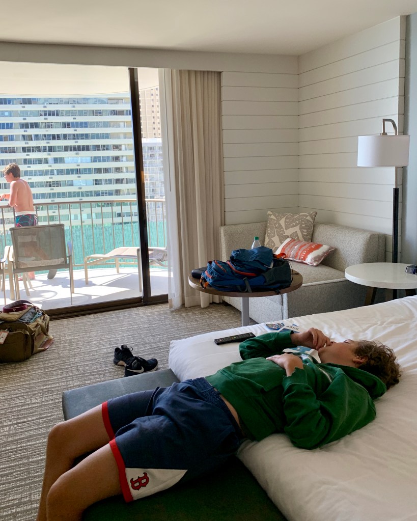 I’m thrilled to report, however, that Hawaiian Air was lovely. We did spring for the Extra-Comfort seats, and while these seats were not even in the same galaxy as the 2 ridiculous Delta One seats we had scored 5 days before, we can confirm that it was money well spent. Theo was also very excited about his complimentary travel kit and quickly (and frequently) set about making sure his face and hands were properly moisturized, which cracked up everyone seated around him (note to others: the “hydrating face spray” has a commanding–and extremely long lasting–scent).